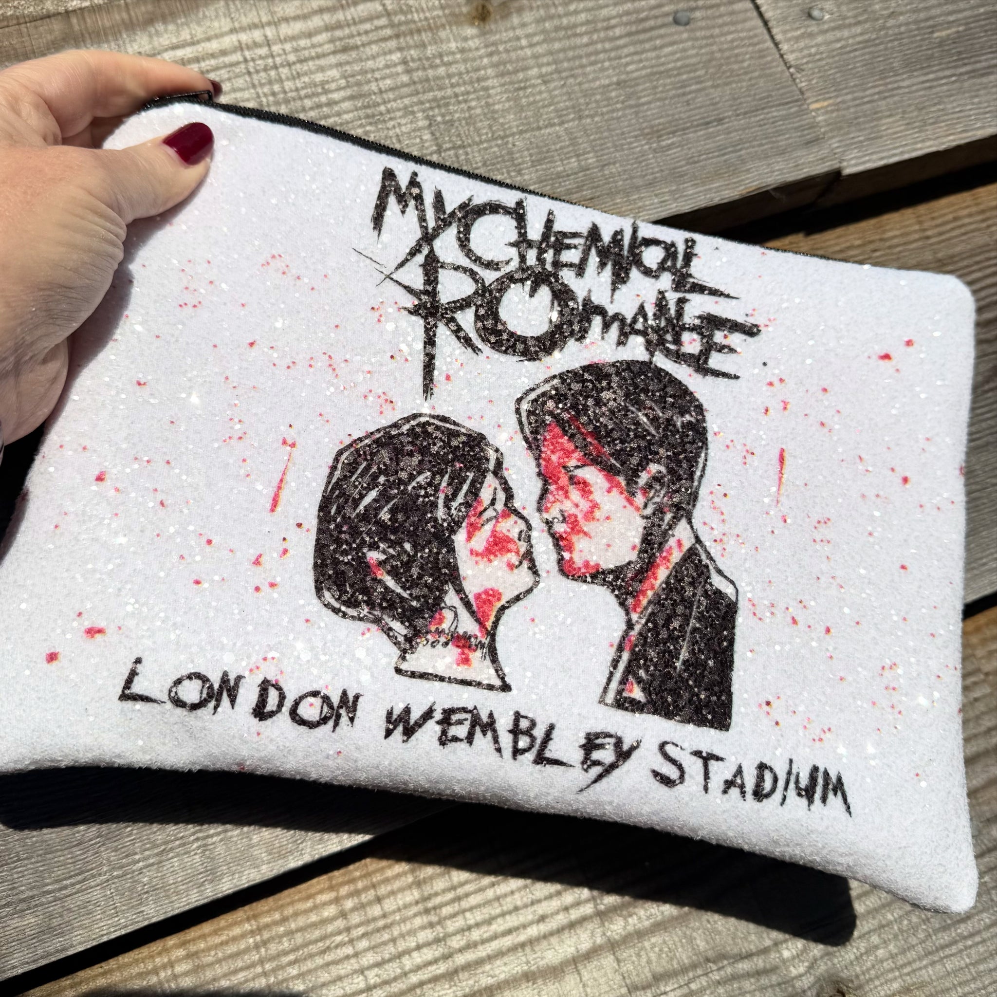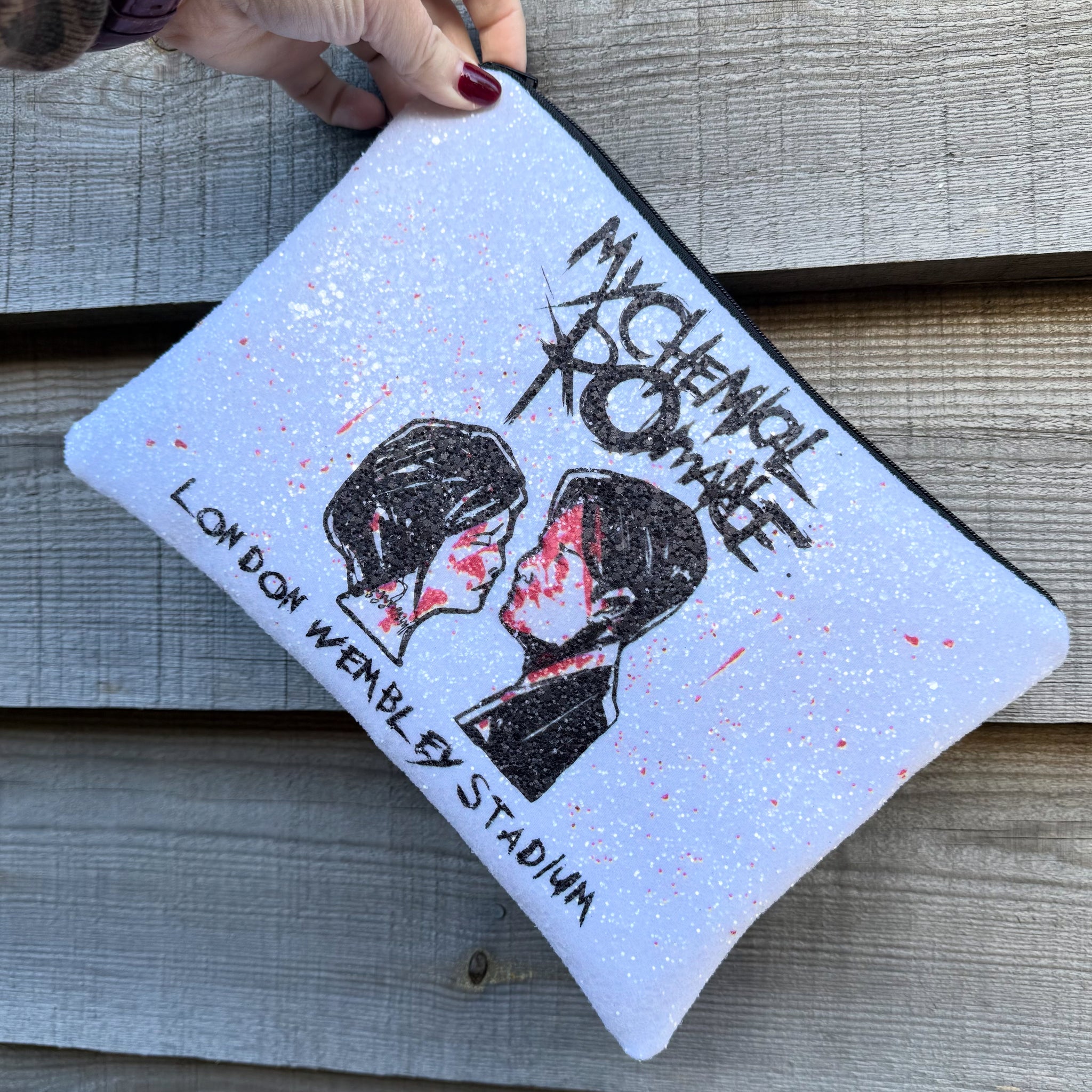Shine brighter than the stage lights with our handmade My Chemical Romance glitter clutch, celebrating the wold tour! Featuring bold, black lettering and a sparkling frosted white glitter.